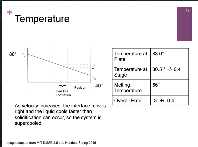 In this experiment, we had a temperature gradient that created a liquid solid interface. By pulling the material across the temperature gradient, we were able to observe dendritic growth as the material solidified. This particular slide is meant to convey the temperature gradient as well as the error due to variation in temperature and our readings of the temperature.